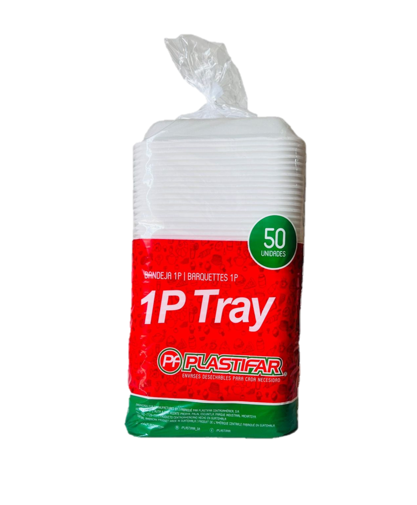 Bandeja 1P Foam Plastifar, ligera, resistente y desechable. Ideal para el transporte y presentación de alimentos.