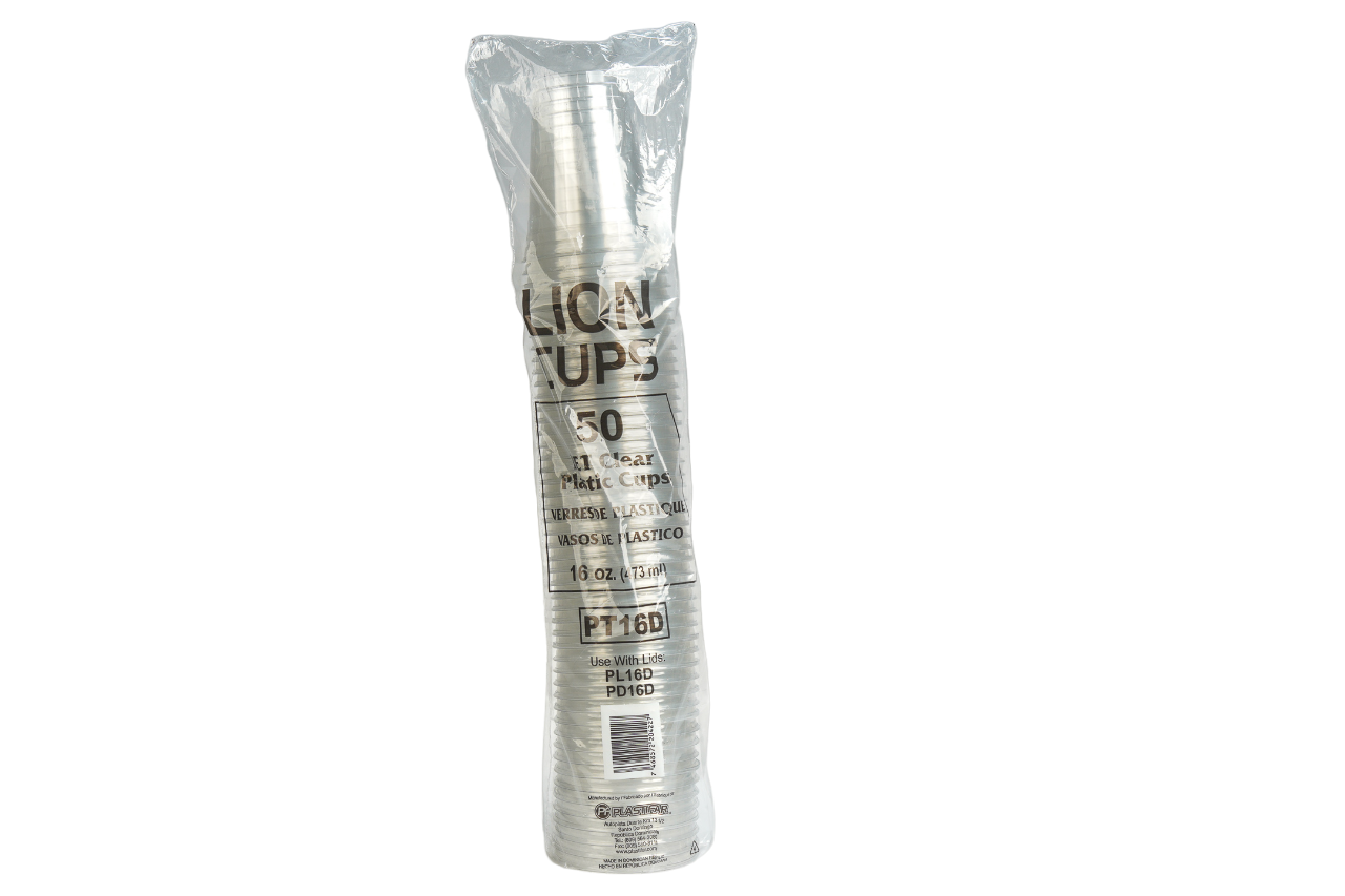 Vaso PET de 16 oz LION, transparente, resistente y perfecto para bebidas frías. Ideal para uso en eventos y negocios.